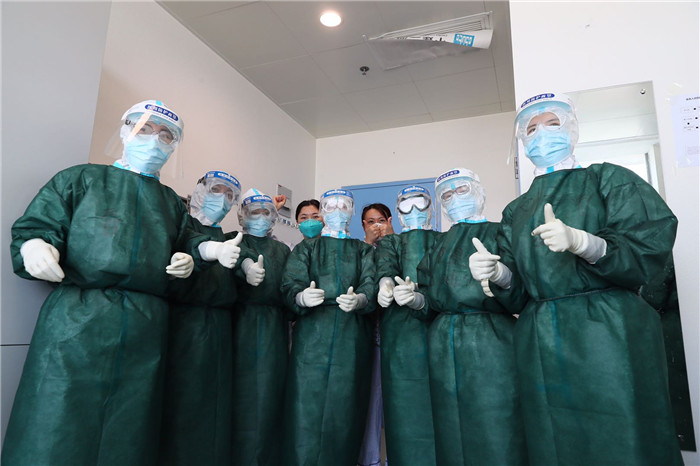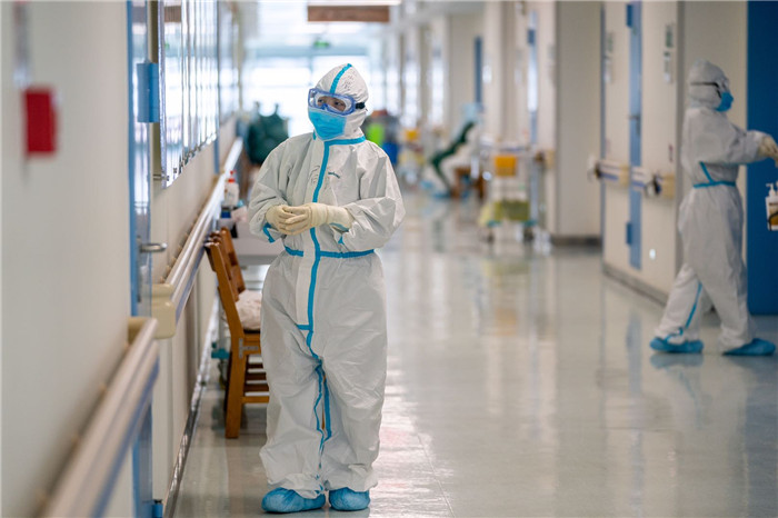 ▲2月23日,来自北京大学人民医院的医护人员在华中科技大学同济医院中法院区做好防护工作准备上岗。摄影陈建/人民画报