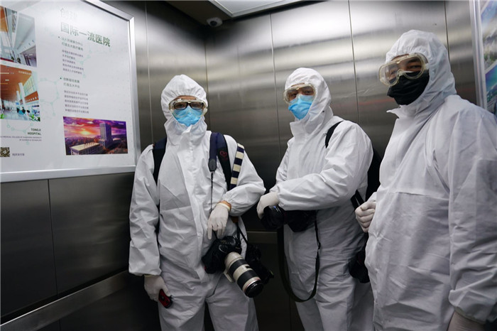 ▲2月23日上午,记者们穿好防护服,出发前往医院采访。