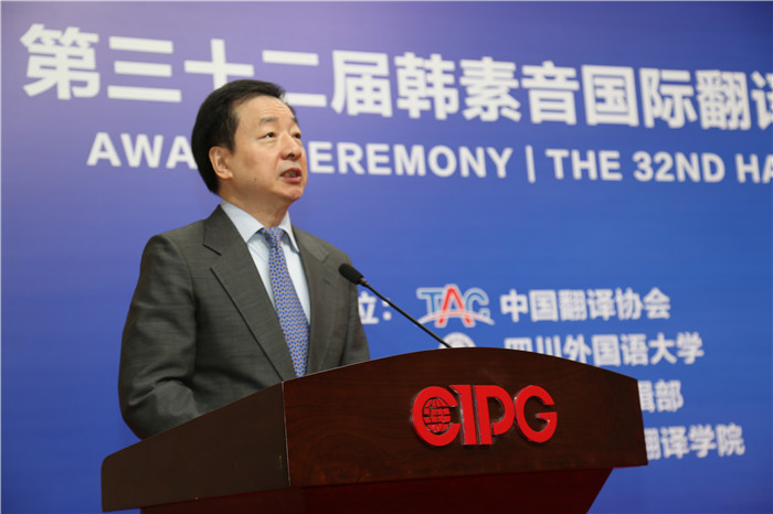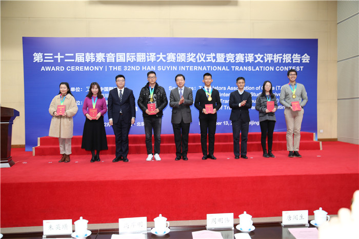 12月13日,第三十二届韩素音国际翻译大赛颁奖仪式暨竞赛译文评析报告会在京举行。本届大赛由中国翻译协会与四川外国语大学联合主办,《中国翻译》编辑部与四川外国语大学翻译学院联合承办。中国外文局副局长兼总编辑高岸明,中国翻译协会会长周明伟,中国译协顾问唐闻生、朱英璜、施燕华、赵常谦、郭晓勇,中国译协副会长、四川外国语大学校长董洪川等出席颁奖仪式并颁奖。来自全国各地的获奖选手代表、最佳组织奖获奖单位代表参加颁奖仪式。
