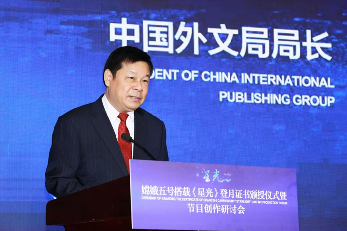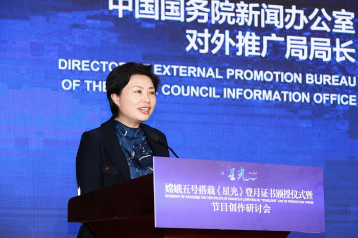 4月16日,嫦娥五号搭载《星光》登月证书颁授仪式暨节目创作研讨会在中国外文局举行。中国外文局局长杜占元、国务院新闻办公室对外推广局局长吴旭、国家航天局探月与航天工程中心主任刘继忠出席颁授仪式并致辞。十三届全国政协委员、文化文史和学习委员会副主任叶小文,阿根廷共和国驻华大使馆副馆长孔磊、津巴布韦共和国驻华使馆临时代办穆噶布库·杜比等嘉宾出席研讨会并发言。