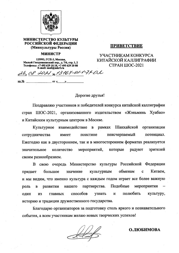 俄罗斯文化部部长奥尔加·柳比莫娃在贺信中表示,近年来,在上海合作组织框架下,人文领域合作成果丰硕,潜力巨大。每年各种形式的双边、多边文化交流活动异彩纷呈,吸引各国民众积极参与。俄罗斯文化部高度重视与中国开展文化交流。诸如“上合组织国家中文书法大赛”这样的活动,就是加深对中国文化、历史和传统了解和喜爱的重要渠道之一。