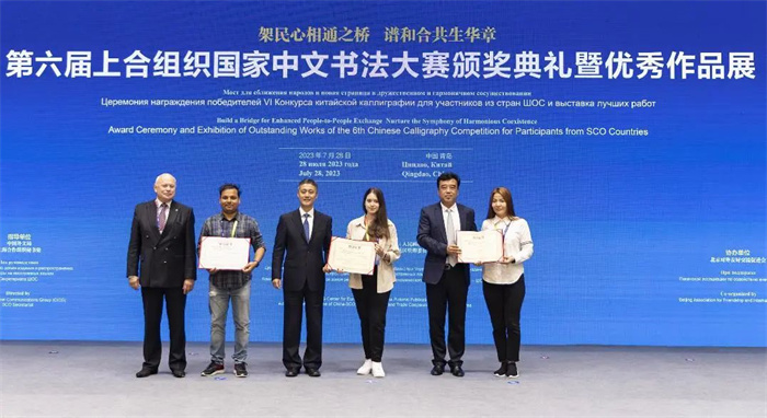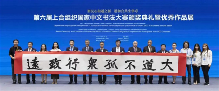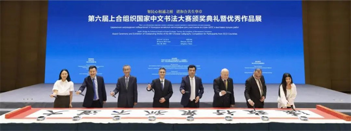 7月28日,由中国外文局、上海合作组织秘书处指导,中国外文局中东欧与中南亚传播中心(人民画报社)、中国—上海合作组织地方经贸合作示范区管理委员会共同主办,北京对外友好交流促进会协办的“第六届上合组织国家中文书法大赛颁奖典礼暨优秀作品展”在青岛·上合之珠国际博览中心举行。