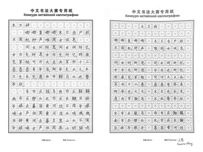 硬笔组一等奖作品选,获奖者分别为别兹列普金娜•阿纳斯塔西娅(俄罗斯)、王菲(阿根廷)