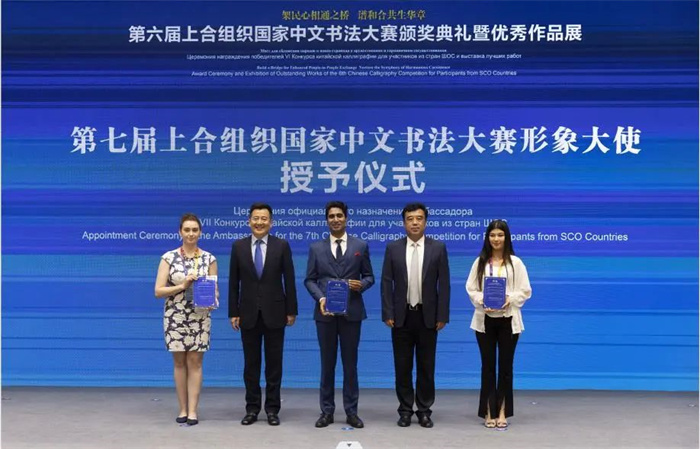 三位来自上合组织国家的书法爱好者被授予“第七届上合组织国家中文书法大赛”形象大使称号