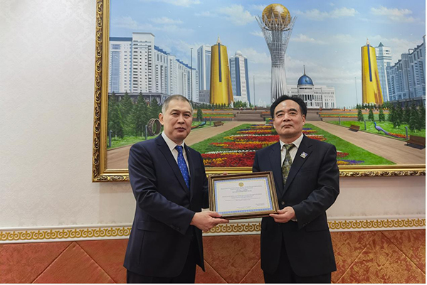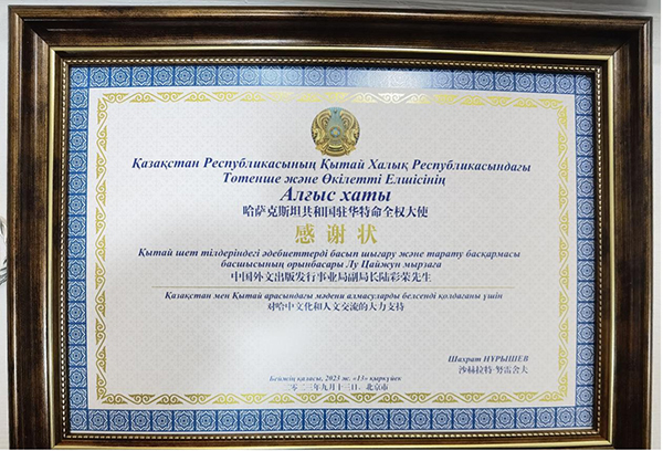 哈萨克斯坦驻华大使沙赫拉特·努雷舍夫为中国外文局副局长陆彩荣颁发感谢状