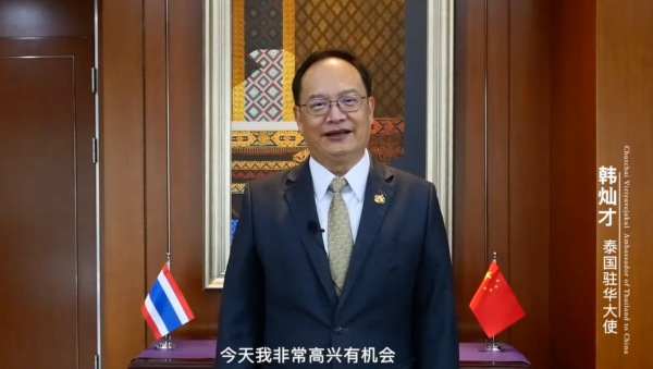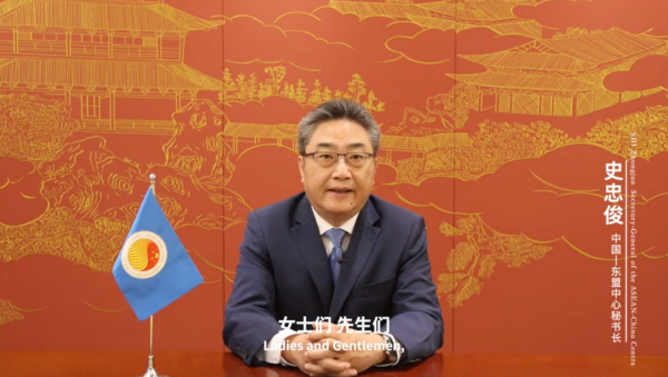 中国—东盟中心秘书长史忠俊、菲律宾驻华大使吉米、泰国驻华大使韩灿才发表视频致辞。中国外文局副局长余应福,对外经济贸易大学副校长、党委副书记文君,国务院国资委新闻中心副主任张义豪出席开幕式并致辞。
