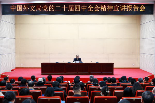 11月27日,中国外文局举行党的二十届四中全会精神宣讲报告会,深入学习贯彻全会精神,全面部署学习宣传贯彻工作。局长常勃以《深学笃行党的二十届四中全会精神,全力推动世界一流国际传播机构建设取得新成效》为题,集中宣讲党的二十届四中全会精神,并为全局党员干部讲授专题党课。副局长于涛、余应福出席会议。